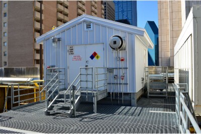 Fuel redundancy was a requirement; therefore, construction of (3) H3 (high hazard fuel storage) buildings would need to be constructed to store up to 4500 gallons of diesel fuel which required extensive building code and fire code analysis and extensive City of Dallas Fire Protection meetings to seek approval and requirements. Automatic Co2 fire suppression systems were introduced along with 3-hour construction and fuel containment dikes as required for spill containment.